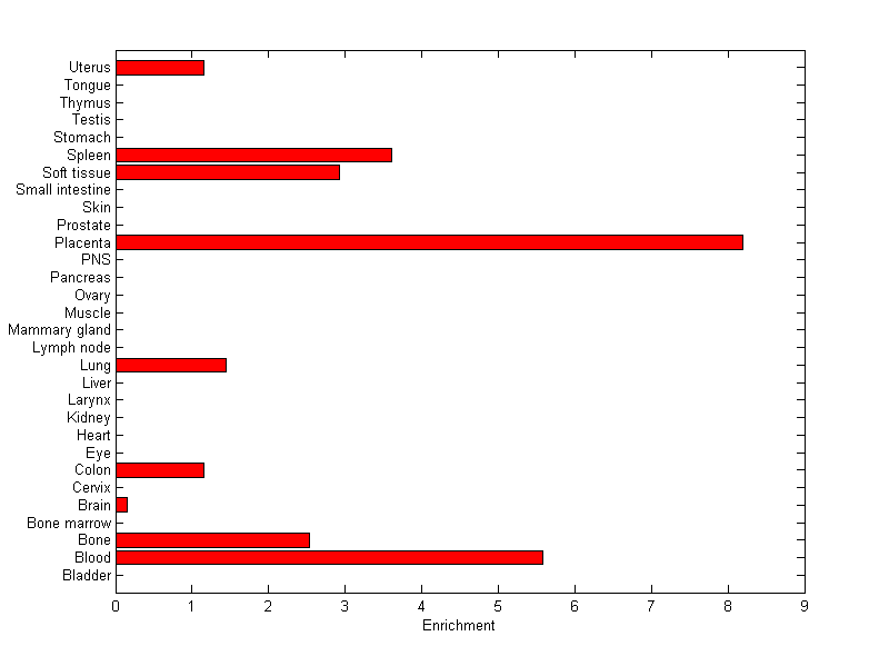 The expression level is normalized with tissue-library size. Each value for a gene in a tissue is a ratio of observed ESTs to the expected one in this tissue. The expected number of ESTs is the product of total ESTs of the gene and the fraction of total ESTs in the tissue among all ESTs in 30 tissues.