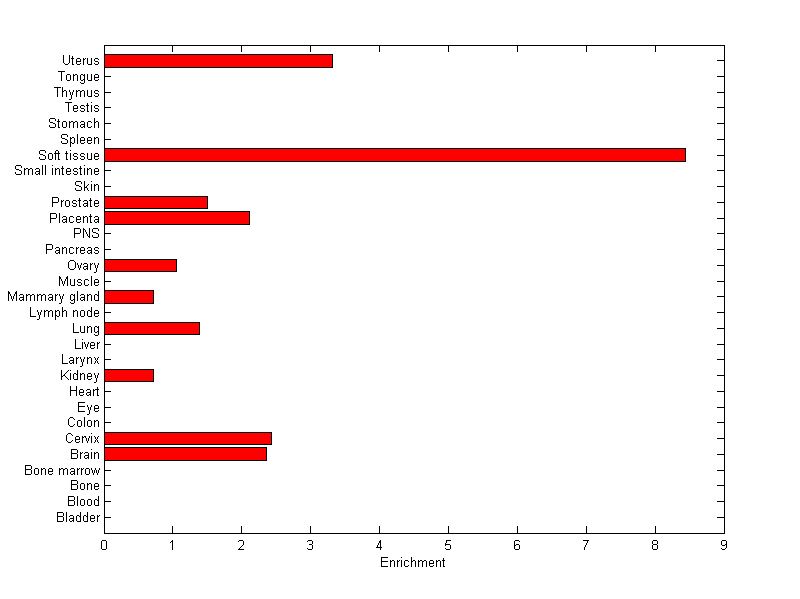 The expression level is normalized with tissue-library size. Each value for a gene in a tissue is a ratio of observed ESTs to the expected one in this tissue. The expected number of ESTs is the product of total ESTs of the gene and the fraction of total ESTs in the tissue among all ESTs in 30 tissues.