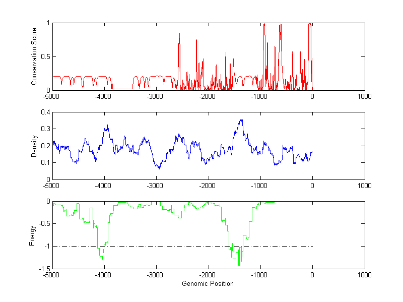 About the profiles: The conservation profile (red curve) is about conservation scores of the promoter sequences. Conservation was determined from an eight-way alignment of human, chimpanzee, dog, mouse, rat, chicken, zebrafish and fugu sequences. The conservation was quantified by a conservation score between 0 and 1, with 1 as highest conservation. The conservation score was obtained from UCSC genome databases. The density profile (blue curve) is about density of all TF binding sites. The energy profile (green curve) is about energy for module detection based on TF interaction. The positions with energy less than -1 indicate the existence of CRMs. Download: Conservation profileDensity profile Energy profile CRM summary |