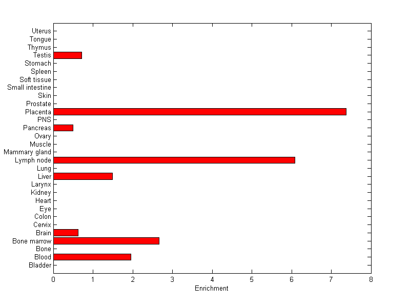 About the profile: The expression level is normalized with tissue-library size. Each value for a gene in a tissue is a ratio of observed ESTs to the expected one in this tissue. The expected number of ESTs is the product of total ESTs of the gene and the fraction of total ESTs in the tissue among all ESTs in 30 tissues. Summary: This gene is preferentially expressed in [lymph_node, placenta] Download: |