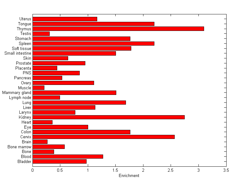 The expression level is normalized with tissue-library size. Each value for a gene in a tissue is a ratio of observed ESTs to the expected one in this tissue. The expected number of ESTs is the product of total ESTs of the gene and the fraction of total ESTs in the tissue among all ESTs in 30 tissues.