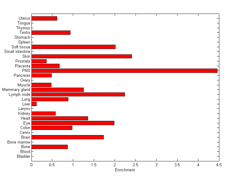The expression level is normalized with tissue-library size. Each value for a gene in a tissue is a ratio of observed ESTs to the expected one in this tissue. The expected number of ESTs is the product of total ESTs of the gene and the fraction of total ESTs in the tissue among all ESTs in 30 tissues.