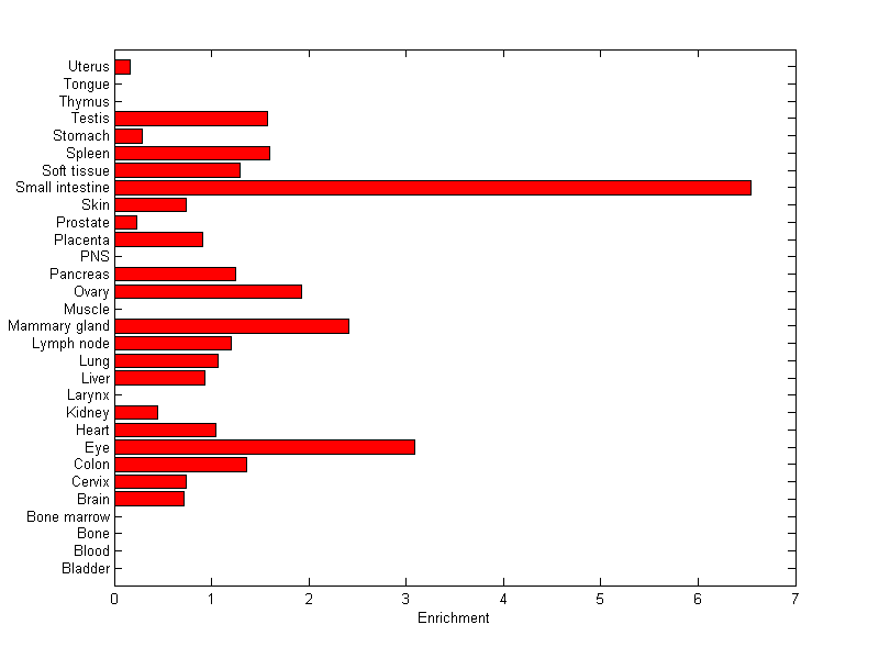 The expression level is normalized with tissue-library size. Each value for a gene in a tissue is a ratio of observed ESTs to the expected one in this tissue. The expected number of ESTs is the product of total ESTs of the gene and the fraction of total ESTs in the tissue among all ESTs in 30 tissues.