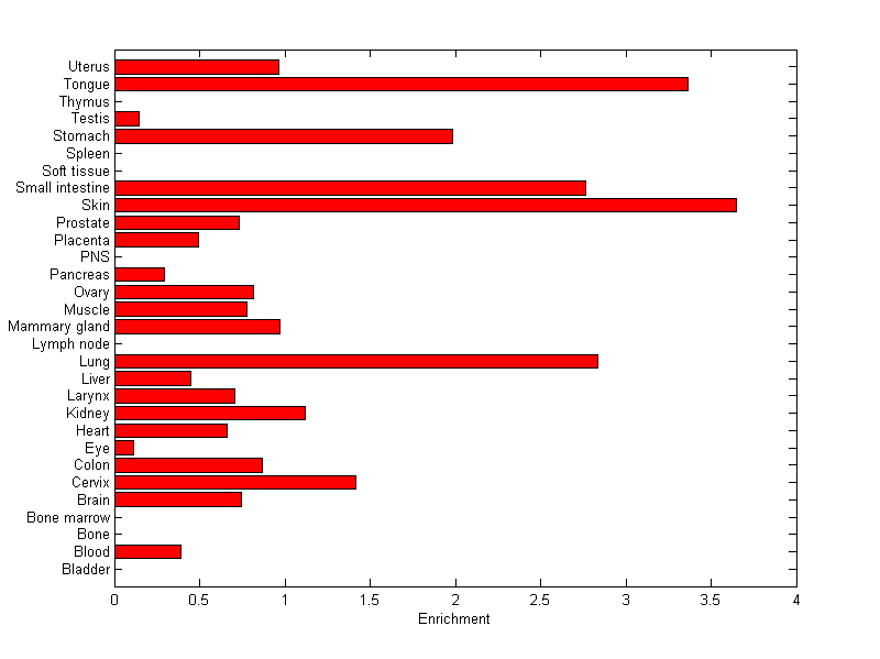 The expression level is normalized with tissue-library size. Each value for a gene in a tissue is a ratio of observed ESTs to the expected one in this tissue. The expected number of ESTs is the product of total ESTs of the gene and the fraction of total ESTs in the tissue among all ESTs in 30 tissues.