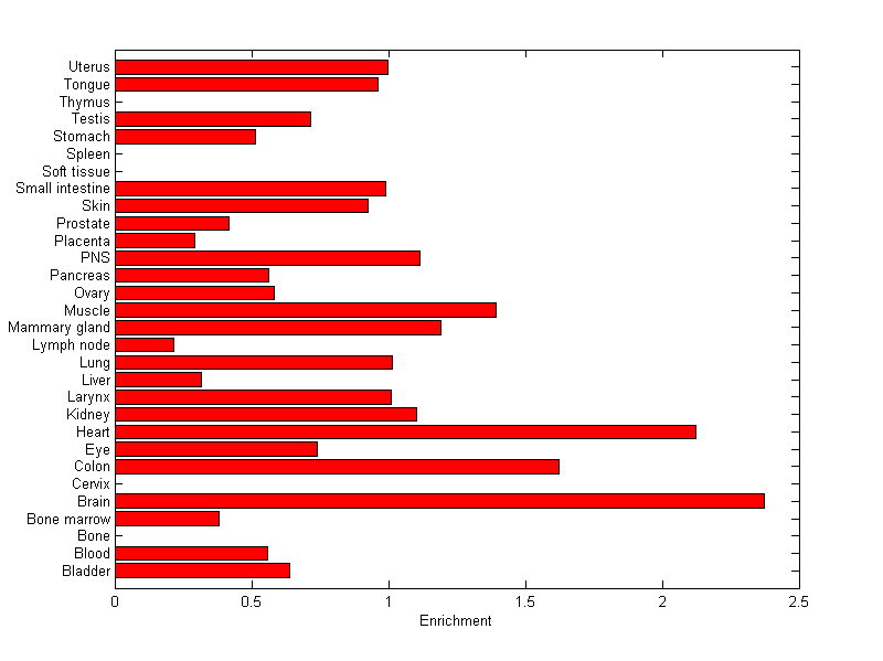 The expression level is normalized with tissue-library size. Each value for a gene in a tissue is a ratio of observed ESTs to the expected one in this tissue. The expected number of ESTs is the product of total ESTs of the gene and the fraction of total ESTs in the tissue among all ESTs in 30 tissues.