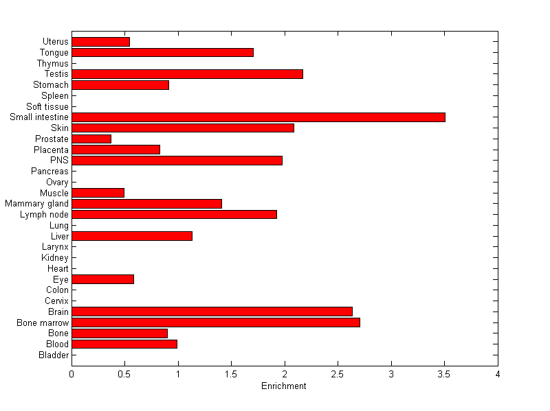 The expression level is normalized with tissue-library size. Each value for a gene in a tissue is a ratio of observed ESTs to the expected one in this tissue. The expected number of ESTs is the product of total ESTs of the gene and the fraction of total ESTs in the tissue among all ESTs in 30 tissues.