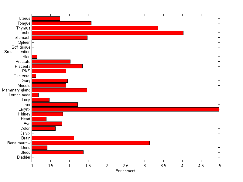 The expression level is normalized with tissue-library size. Each value for a gene in a tissue is a ratio of observed ESTs to the expected one in this tissue. The expected number of ESTs is the product of total ESTs of the gene and the fraction of total ESTs in the tissue among all ESTs in 30 tissues.