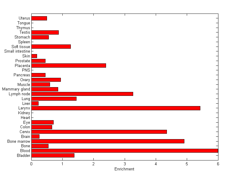 The expression level is normalized with tissue-library size. Each value for a gene in a tissue is a ratio of observed ESTs to the expected one in this tissue. The expected number of ESTs is the product of total ESTs of the gene and the fraction of total ESTs in the tissue among all ESTs in 30 tissues.