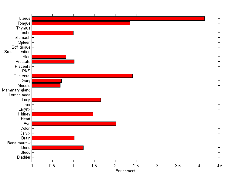 The expression level is normalized with tissue-library size. Each value for a gene in a tissue is a ratio of observed ESTs to the expected one in this tissue. The expected number of ESTs is the product of total ESTs of the gene and the fraction of total ESTs in the tissue among all ESTs in 30 tissues.