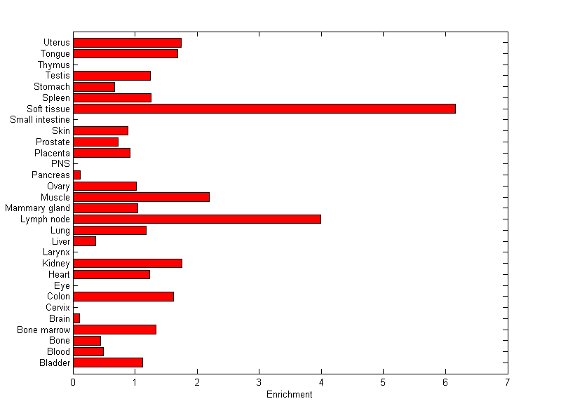 The expression level is normalized with tissue-library size. Each value for a gene in a tissue is a ratio of observed ESTs to the expected one in this tissue. The expected number of ESTs is the product of total ESTs of the gene and the fraction of total ESTs in the tissue among all ESTs in 30 tissues.