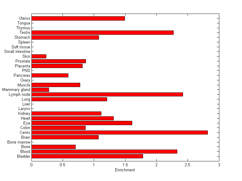 The expression level is normalized with tissue-library size. Each value for a gene in a tissue is a ratio of observed ESTs to the expected one in this tissue. The expected number of ESTs is the product of total ESTs of the gene and the fraction of total ESTs in the tissue among all ESTs in 30 tissues.