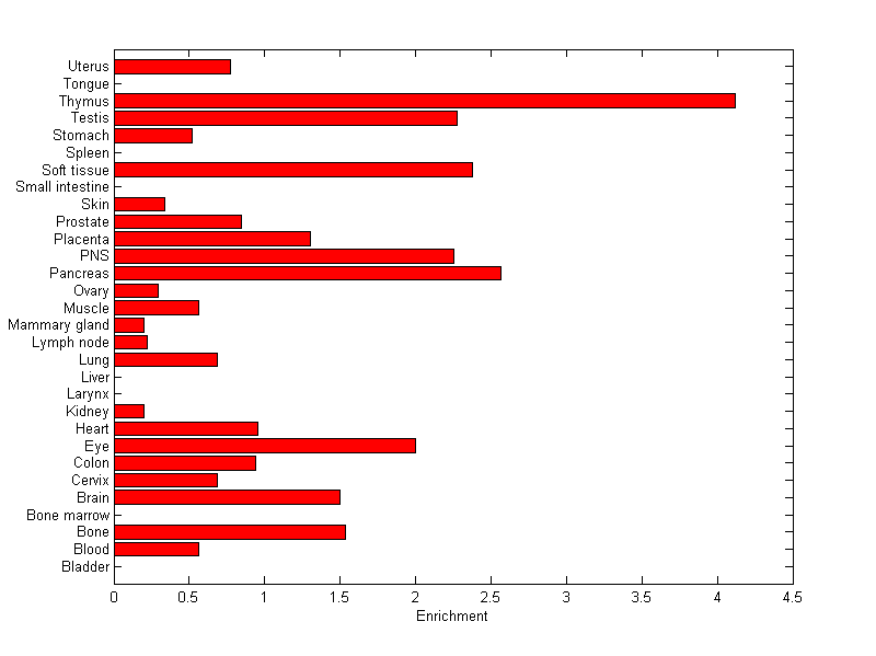 The expression level is normalized with tissue-library size. Each value for a gene in a tissue is a ratio of observed ESTs to the expected one in this tissue. The expected number of ESTs is the product of total ESTs of the gene and the fraction of total ESTs in the tissue among all ESTs in 30 tissues.