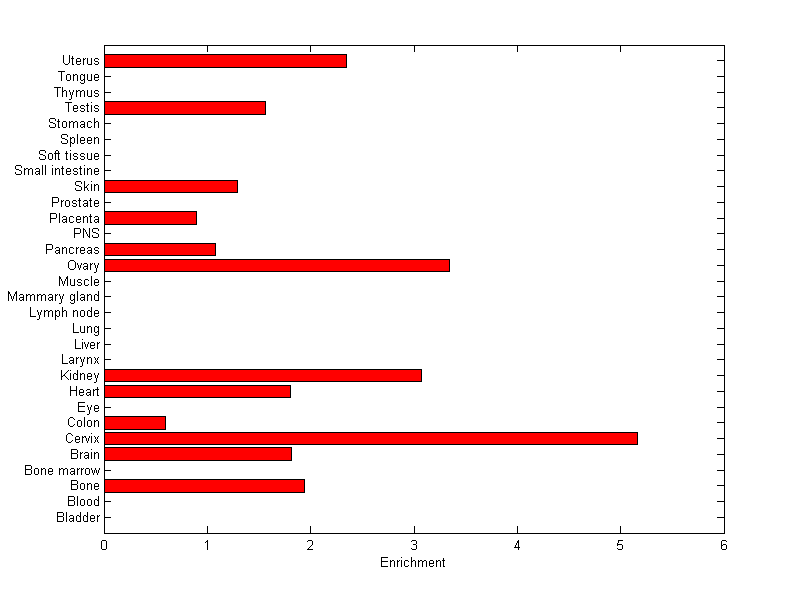 The expression level is normalized with tissue-library size. Each value for a gene in a tissue is a ratio of observed ESTs to the expected one in this tissue. The expected number of ESTs is the product of total ESTs of the gene and the fraction of total ESTs in the tissue among all ESTs in 30 tissues.