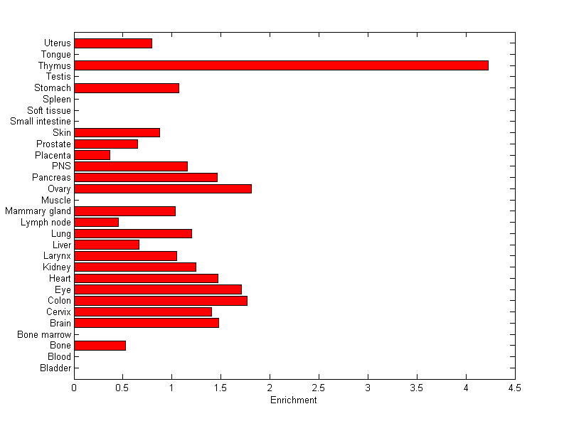 The expression level is normalized with tissue-library size. Each value for a gene in a tissue is a ratio of observed ESTs to the expected one in this tissue. The expected number of ESTs is the product of total ESTs of the gene and the fraction of total ESTs in the tissue among all ESTs in 30 tissues.