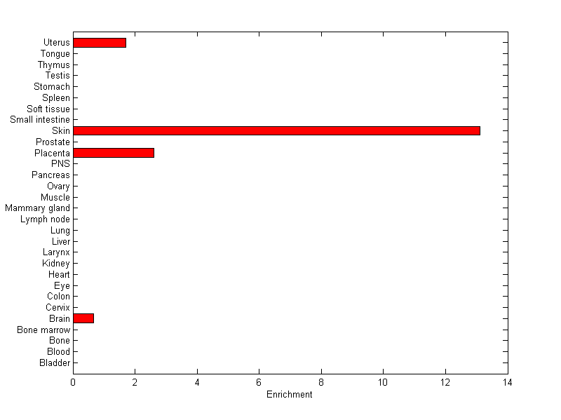 The expression level is normalized with tissue-library size. Each value for a gene in a tissue is a ratio of observed ESTs to the expected one in this tissue. The expected number of ESTs is the product of total ESTs of the gene and the fraction of total ESTs in the tissue among all ESTs in 30 tissues.