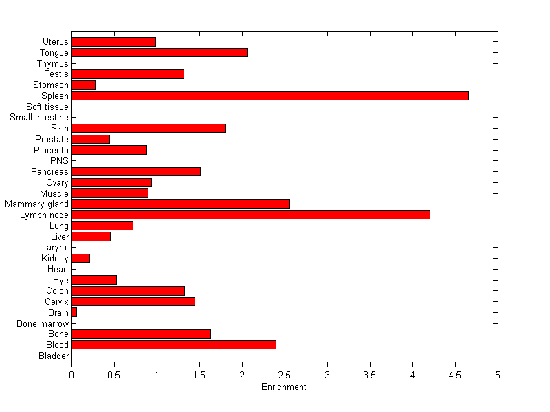 The expression level is normalized with tissue-library size. Each value for a gene in a tissue is a ratio of observed ESTs to the expected one in this tissue. The expected number of ESTs is the product of total ESTs of the gene and the fraction of total ESTs in the tissue among all ESTs in 30 tissues.