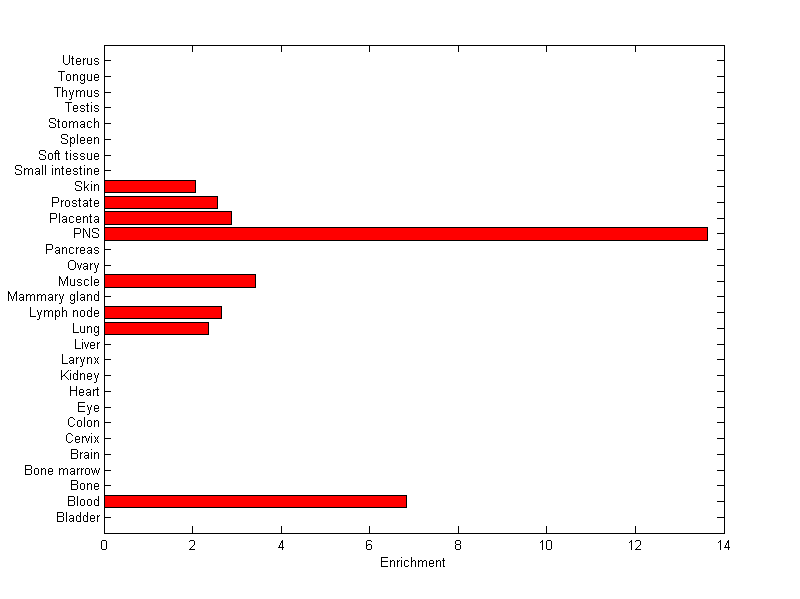 The expression level is normalized with tissue-library size. Each value for a gene in a tissue is a ratio of observed ESTs to the expected one in this tissue. The expected number of ESTs is the product of total ESTs of the gene and the fraction of total ESTs in the tissue among all ESTs in 30 tissues.