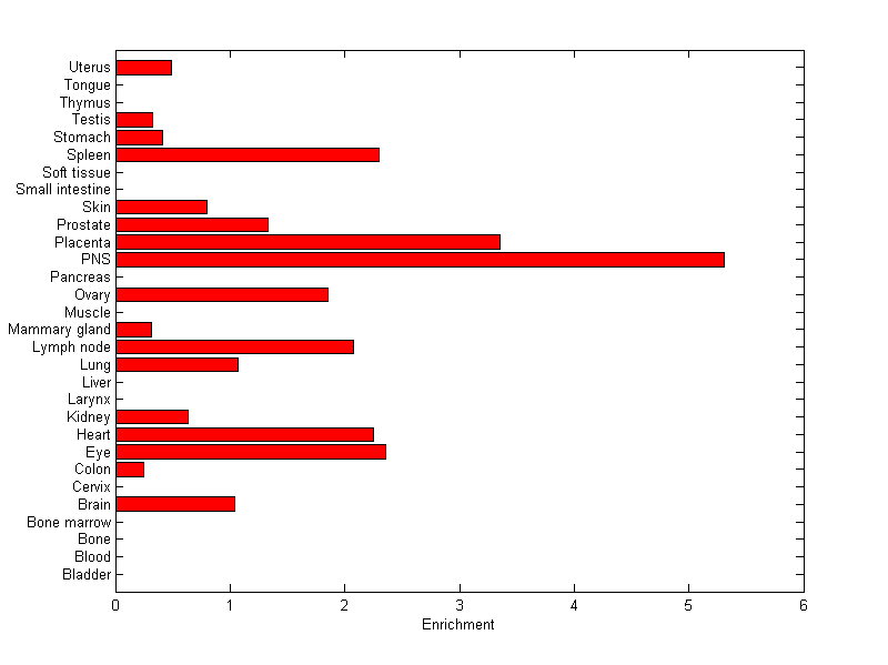The expression level is normalized with tissue-library size. Each value for a gene in a tissue is a ratio of observed ESTs to the expected one in this tissue. The expected number of ESTs is the product of total ESTs of the gene and the fraction of total ESTs in the tissue among all ESTs in 30 tissues.