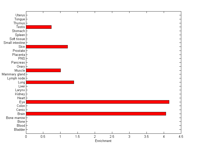The expression level is normalized with tissue-library size. Each value for a gene in a tissue is a ratio of observed ESTs to the expected one in this tissue. The expected number of ESTs is the product of total ESTs of the gene and the fraction of total ESTs in the tissue among all ESTs in 30 tissues.