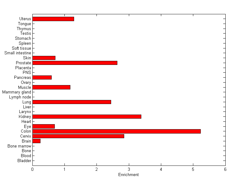 The expression level is normalized with tissue-library size. Each value for a gene in a tissue is a ratio of observed ESTs to the expected one in this tissue. The expected number of ESTs is the product of total ESTs of the gene and the fraction of total ESTs in the tissue among all ESTs in 30 tissues.