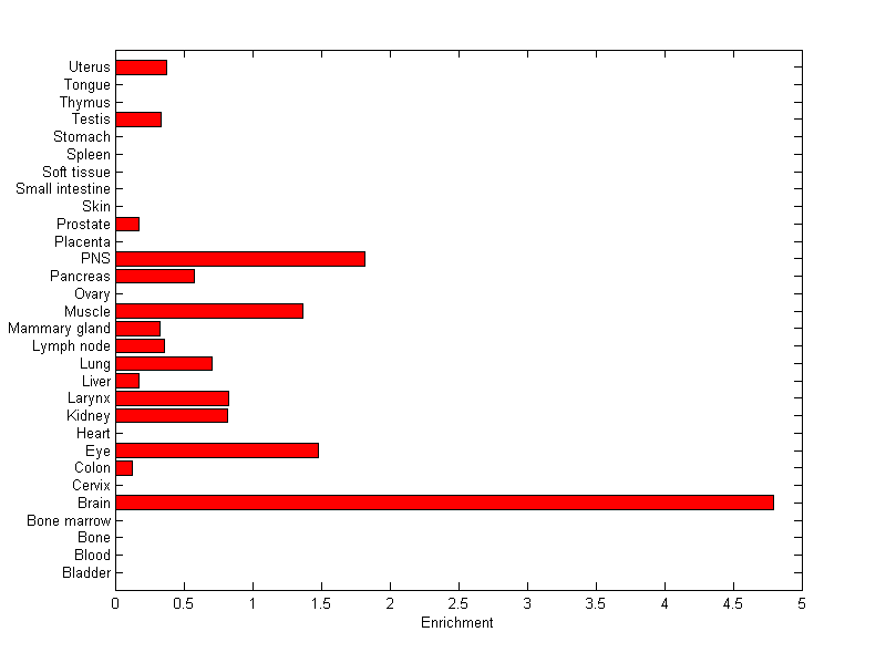 The expression level is normalized with tissue-library size. Each value for a gene in a tissue is a ratio of observed ESTs to the expected one in this tissue. The expected number of ESTs is the product of total ESTs of the gene and the fraction of total ESTs in the tissue among all ESTs in 30 tissues.