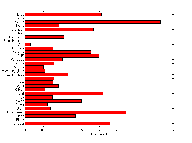 The expression level is normalized with tissue-library size. Each value for a gene in a tissue is a ratio of observed ESTs to the expected one in this tissue. The expected number of ESTs is the product of total ESTs of the gene and the fraction of total ESTs in the tissue among all ESTs in 30 tissues.