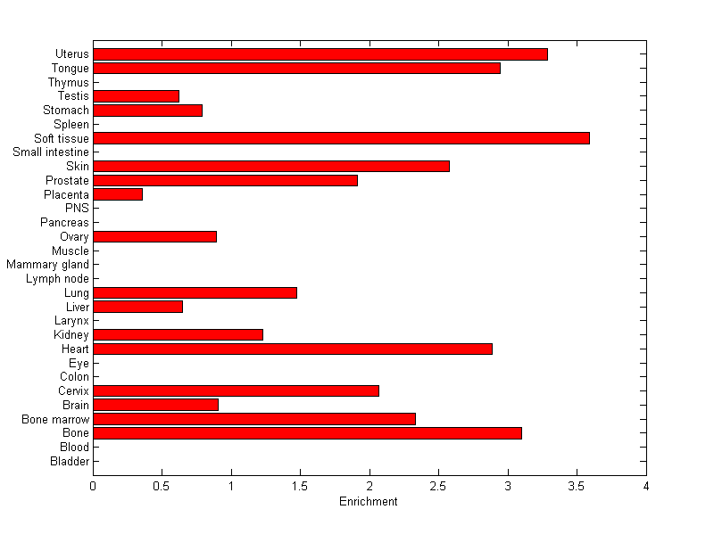 The expression level is normalized with tissue-library size. Each value for a gene in a tissue is a ratio of observed ESTs to the expected one in this tissue. The expected number of ESTs is the product of total ESTs of the gene and the fraction of total ESTs in the tissue among all ESTs in 30 tissues.