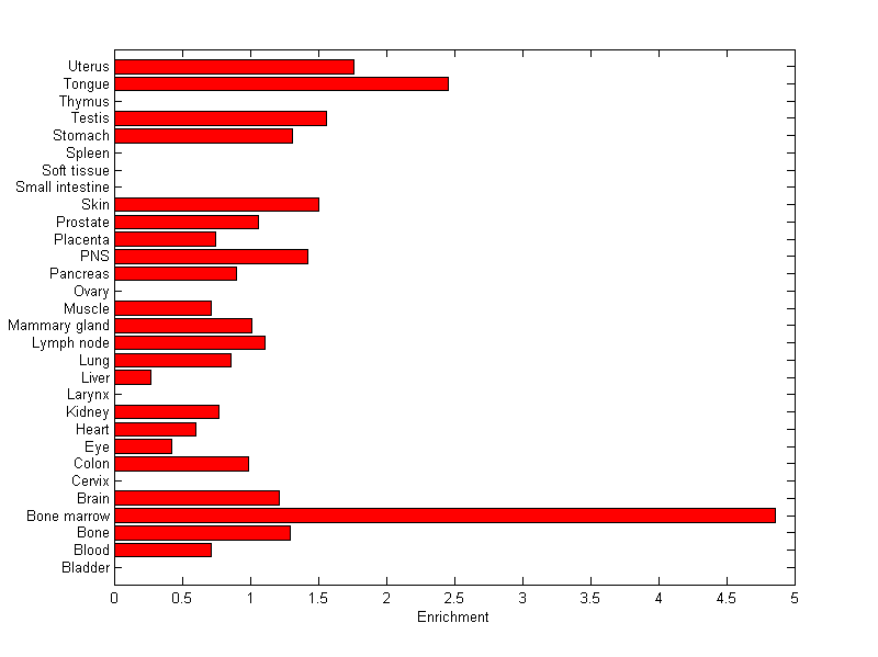 The expression level is normalized with tissue-library size. Each value for a gene in a tissue is a ratio of observed ESTs to the expected one in this tissue. The expected number of ESTs is the product of total ESTs of the gene and the fraction of total ESTs in the tissue among all ESTs in 30 tissues.