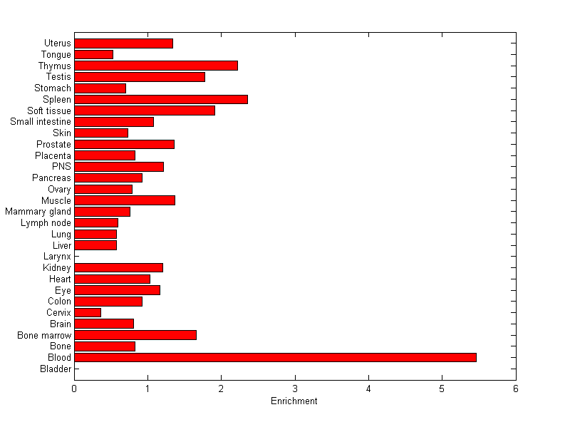 The expression level is normalized with tissue-library size. Each value for a gene in a tissue is a ratio of observed ESTs to the expected one in this tissue. The expected number of ESTs is the product of total ESTs of the gene and the fraction of total ESTs in the tissue among all ESTs in 30 tissues.