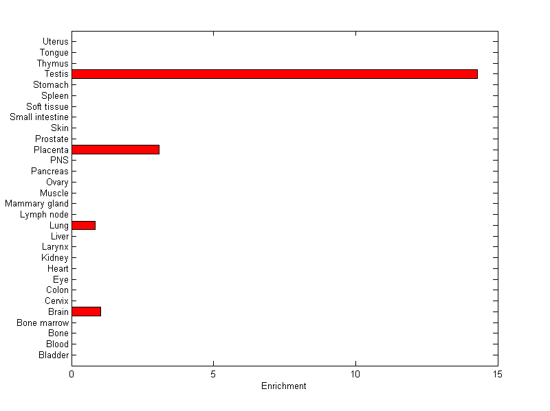 The expression level is normalized with tissue-library size. Each value for a gene in a tissue is a ratio of observed ESTs to the expected one in this tissue. The expected number of ESTs is the product of total ESTs of the gene and the fraction of total ESTs in the tissue among all ESTs in 30 tissues.