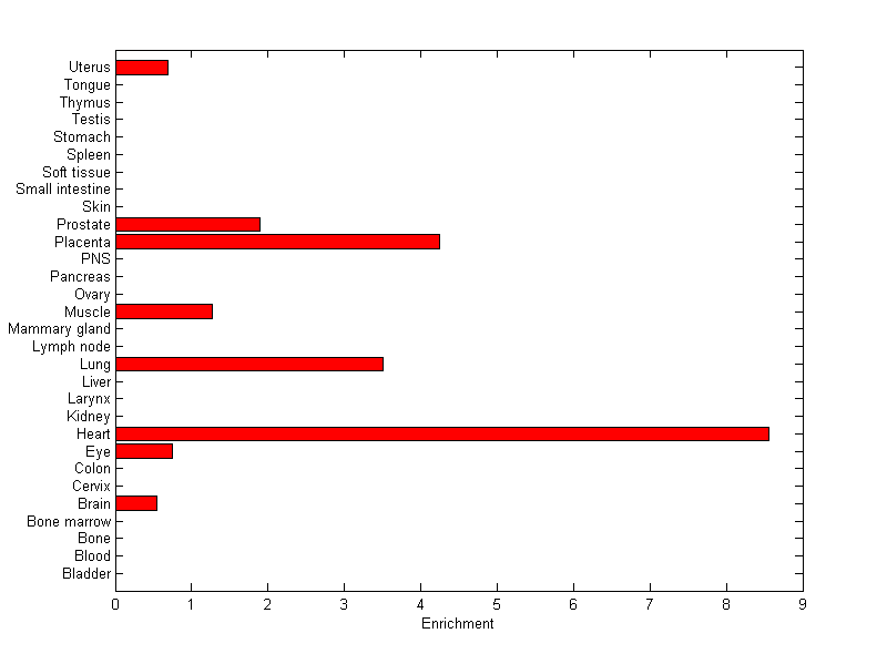 The expression level is normalized with tissue-library size. Each value for a gene in a tissue is a ratio of observed ESTs to the expected one in this tissue. The expected number of ESTs is the product of total ESTs of the gene and the fraction of total ESTs in the tissue among all ESTs in 30 tissues.