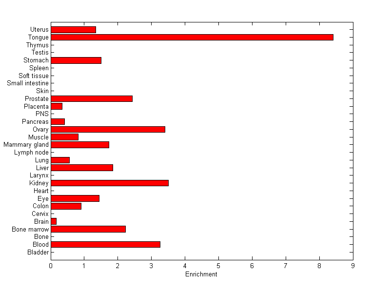 The expression level is normalized with tissue-library size. Each value for a gene in a tissue is a ratio of observed ESTs to the expected one in this tissue. The expected number of ESTs is the product of total ESTs of the gene and the fraction of total ESTs in the tissue among all ESTs in 30 tissues.