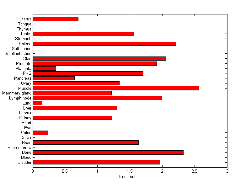 The expression level is normalized with tissue-library size. Each value for a gene in a tissue is a ratio of observed ESTs to the expected one in this tissue. The expected number of ESTs is the product of total ESTs of the gene and the fraction of total ESTs in the tissue among all ESTs in 30 tissues.