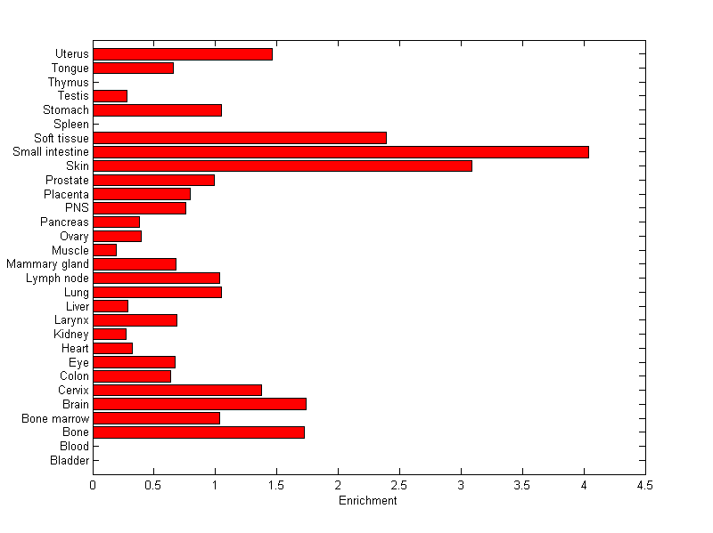 The expression level is normalized with tissue-library size. Each value for a gene in a tissue is a ratio of observed ESTs to the expected one in this tissue. The expected number of ESTs is the product of total ESTs of the gene and the fraction of total ESTs in the tissue among all ESTs in 30 tissues.