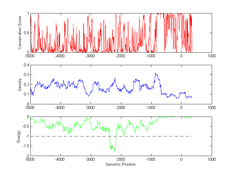 About the profiles: The conservation profile (red curve) is about conservation scores of the promoter sequences. Conservation was determined from an eight-way alignment of human, chimpanzee, dog, mouse, rat, chicken, zebrafish and fugu sequences. The conservation was quantified by a conservation score between 0 and 1, with 1 as highest conservation. The conservation score was obtained from UCSC genome databases. The density profile (blue curve) is about density of all TF binding sites. The energy profile (green curve) is about energy for module detection based on TF interaction. The positions with energy less than -1 indicate the existence of CRMs. Download: Conservation profileDensity profile Energy profile CRM summary |