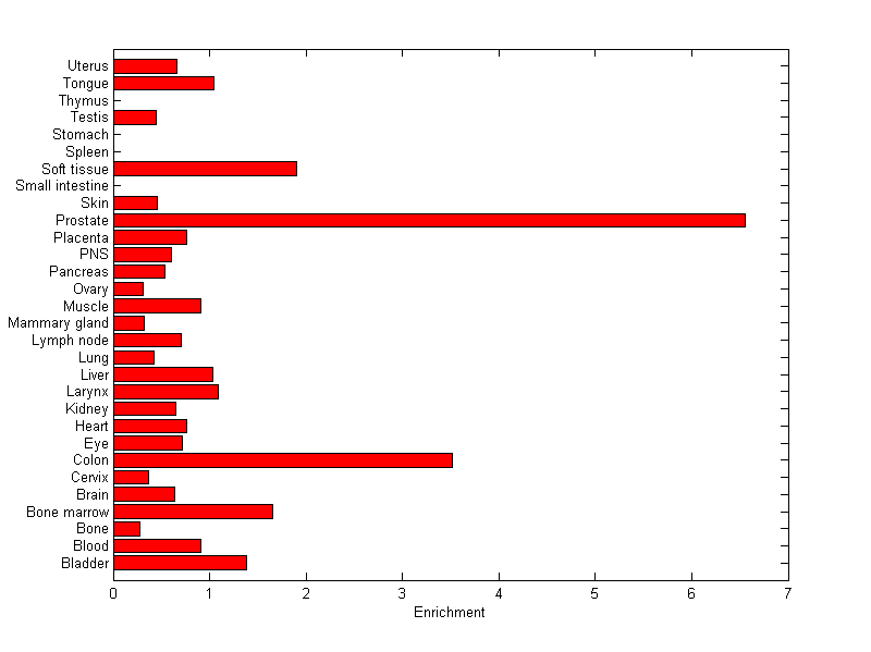About the profile: The expression level is normalized with tissue-library size. Each value for a gene in a tissue is a ratio of observed ESTs to the expected one in this tissue. The expected number of ESTs is the product of total ESTs of the gene and the fraction of total ESTs in the tissue among all ESTs in 30 tissues. Summary: This gene is preferentially expressed in [prostate] Download: |