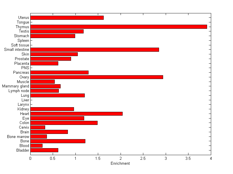 The expression level is normalized with tissue-library size. Each value for a gene in a tissue is a ratio of observed ESTs to the expected one in this tissue. The expected number of ESTs is the product of total ESTs of the gene and the fraction of total ESTs in the tissue among all ESTs in 30 tissues.