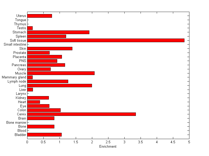 The expression level is normalized with tissue-library size. Each value for a gene in a tissue is a ratio of observed ESTs to the expected one in this tissue. The expected number of ESTs is the product of total ESTs of the gene and the fraction of total ESTs in the tissue among all ESTs in 30 tissues.