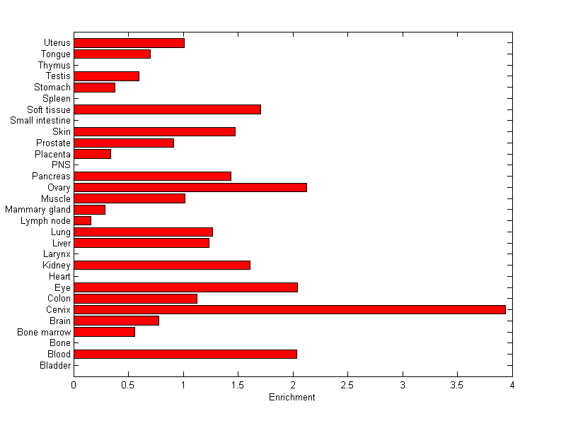 The expression level is normalized with tissue-library size. Each value for a gene in a tissue is a ratio of observed ESTs to the expected one in this tissue. The expected number of ESTs is the product of total ESTs of the gene and the fraction of total ESTs in the tissue among all ESTs in 30 tissues.