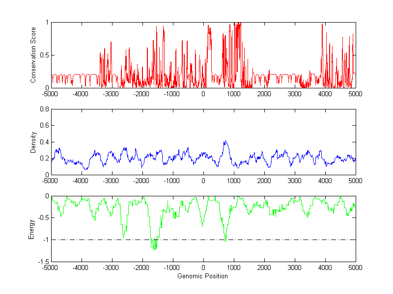 The energy profile (green curve) is about energy for module detection based on TF interaction. The positions with energy less than -1 indicate the existence of CRMs.