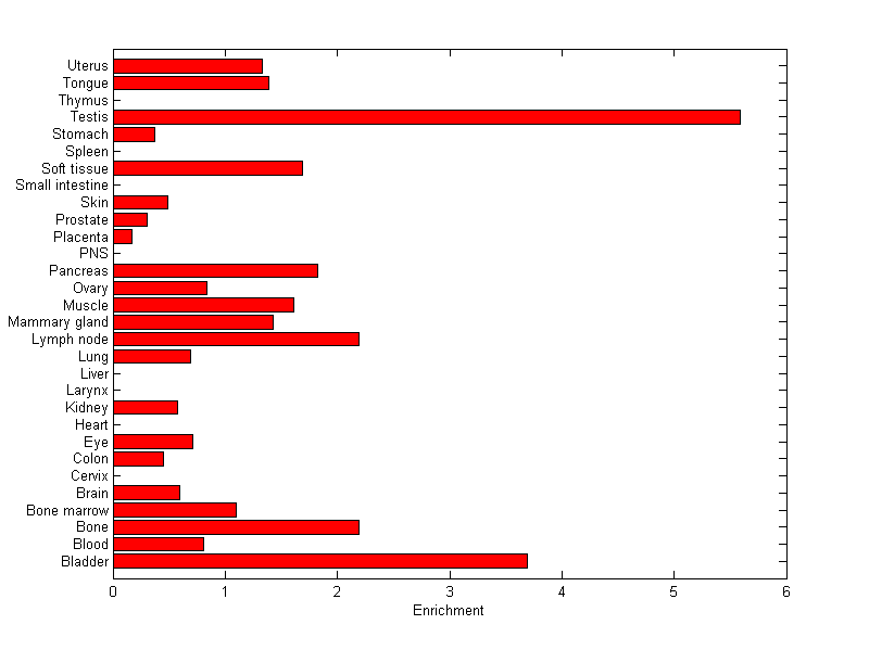 The expression level is normalized with tissue-library size. Each value for a gene in a tissue is a ratio of observed ESTs to the expected one in this tissue. The expected number of ESTs is the product of total ESTs of the gene and the fraction of total ESTs in the tissue among all ESTs in 30 tissues.