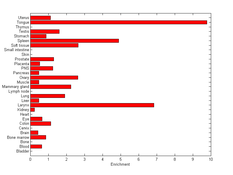 About the profile: The expression level is normalized with tissue-library size. Each value for a gene in a tissue is a ratio of observed ESTs to the expected one in this tissue. The expected number of ESTs is the product of total ESTs of the gene and the fraction of total ESTs in the tissue among all ESTs in 30 tissues. Summary: This gene is preferentially expressed in [larynx, tongue] Download: |