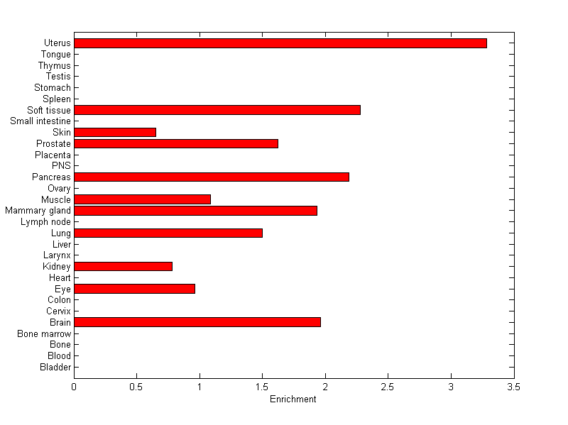 The expression level is normalized with tissue-library size. Each value for a gene in a tissue is a ratio of observed ESTs to the expected one in this tissue. The expected number of ESTs is the product of total ESTs of the gene and the fraction of total ESTs in the tissue among all ESTs in 30 tissues.