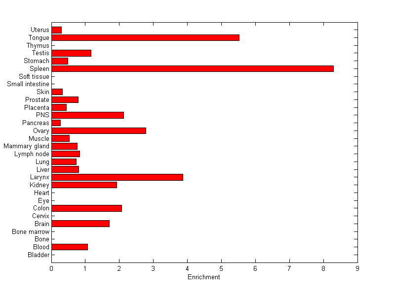 The expression level is normalized with tissue-library size. Each value for a gene in a tissue is a ratio of observed ESTs to the expected one in this tissue. The expected number of ESTs is the product of total ESTs of the gene and the fraction of total ESTs in the tissue among all ESTs in 30 tissues.