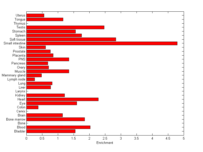 The expression level is normalized with tissue-library size. Each value for a gene in a tissue is a ratio of observed ESTs to the expected one in this tissue. The expected number of ESTs is the product of total ESTs of the gene and the fraction of total ESTs in the tissue among all ESTs in 30 tissues.