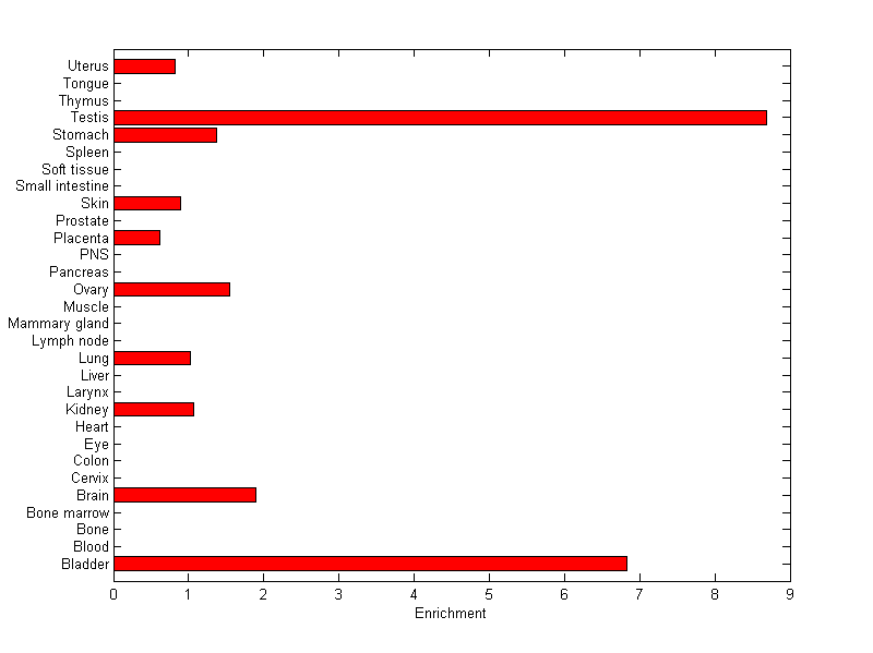 The expression level is normalized with tissue-library size. Each value for a gene in a tissue is a ratio of observed ESTs to the expected one in this tissue. The expected number of ESTs is the product of total ESTs of the gene and the fraction of total ESTs in the tissue among all ESTs in 30 tissues.