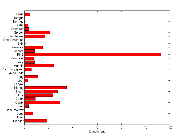 The expression level is normalized with tissue-library size. Each value for a gene in a tissue is a ratio of observed ESTs to the expected one in this tissue. The expected number of ESTs is the product of total ESTs of the gene and the fraction of total ESTs in the tissue among all ESTs in 30 tissues.