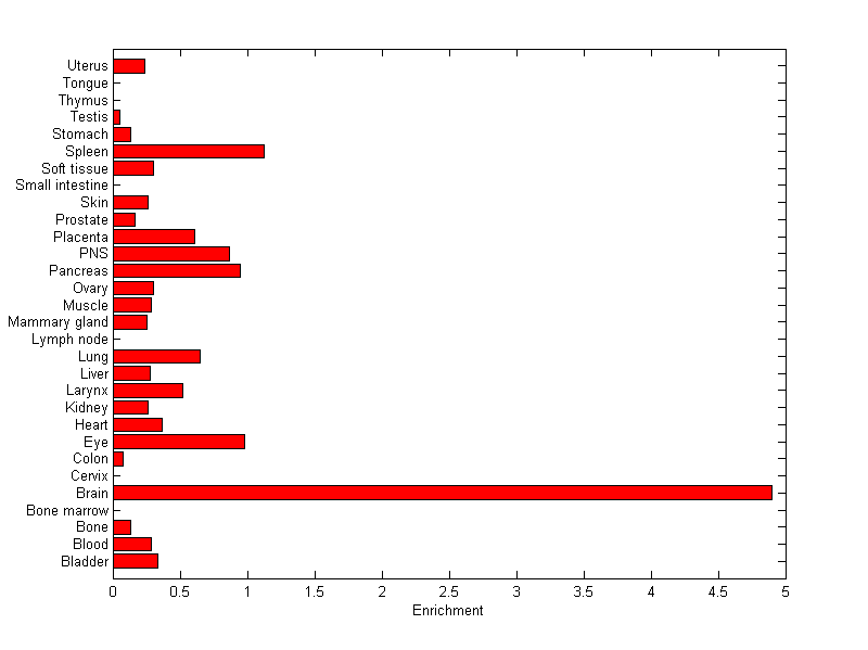 The expression level is normalized with tissue-library size. Each value for a gene in a tissue is a ratio of observed ESTs to the expected one in this tissue. The expected number of ESTs is the product of total ESTs of the gene and the fraction of total ESTs in the tissue among all ESTs in 30 tissues.