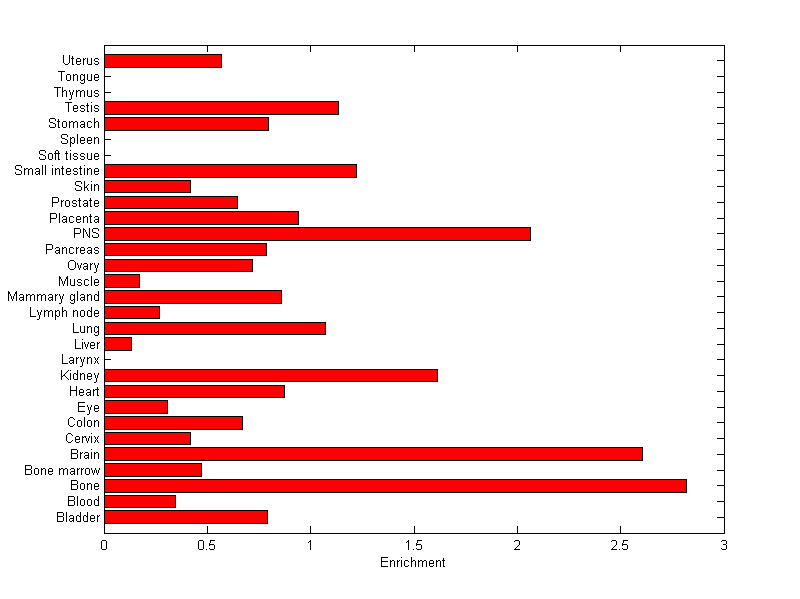The expression level is normalized with tissue-library size. Each value for a gene in a tissue is a ratio of observed ESTs to the expected one in this tissue. The expected number of ESTs is the product of total ESTs of the gene and the fraction of total ESTs in the tissue among all ESTs in 30 tissues.