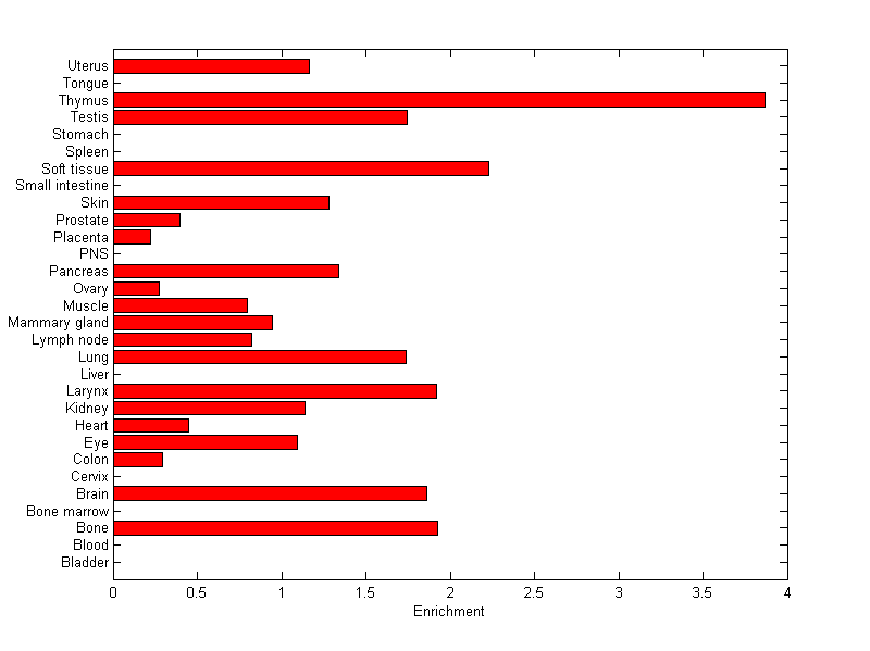 The expression level is normalized with tissue-library size. Each value for a gene in a tissue is a ratio of observed ESTs to the expected one in this tissue. The expected number of ESTs is the product of total ESTs of the gene and the fraction of total ESTs in the tissue among all ESTs in 30 tissues.